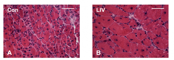This photo shows the effect on healing muscle of 45 Hz vibration for 30 minutes per day. It shows muscle fibres in cross section. You can clearly see that the oval shaped muscle fibre cross sections are much larger in the pic on the right where vibration has been used (15).