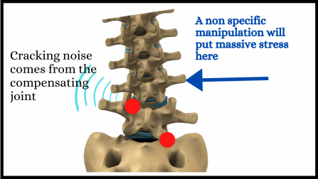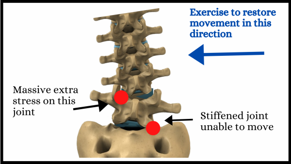 We want the spine to start using the restricted joints, but not cause the compensating joint to compensate. Appropriate exercises are usually repeated movements designed to take the spine through comfortable ranges of movement, but not try and force extra movement.