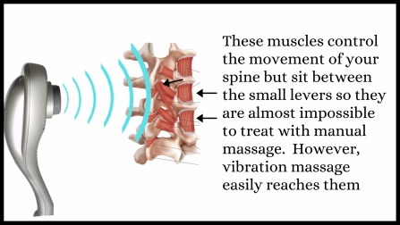 The vibrations are able to easily penetrate deeply to even the deep, hard to get at trigger points. This diagram shows a very important example. A lot of the very important muscles of the spine sit deep around the spine protected by bony levers. Conventional massage and pressure trigger point releases cannot get to these muscles, while vibrations easily do.