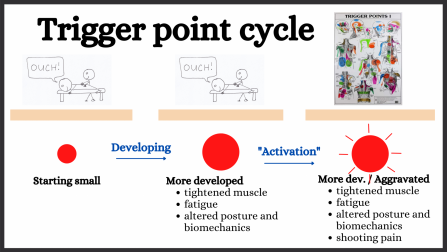 As shown in this diagram trigger points start small and gradually grow over years or decades. At first you will only know they are there if a therapist presses on them. As they grow the muscle will gradually tighten, causing restricted movement and possibly altered posture or fatigue. Eventually something may aggravate the trigger point causing it to spontaneously shoot pain.